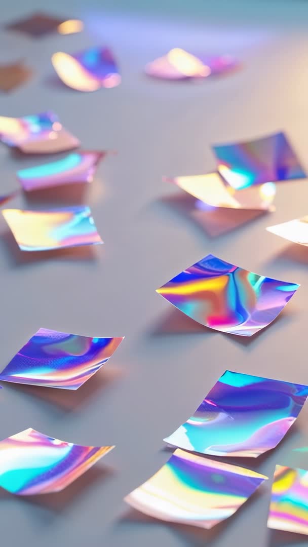 AI Generated Image. Vertical short clip featuring tilting holographic foil squares fluttering across desk surface, revealing shifting rainbow hues and iridescent reflections. Soft studio lighting and shallow depth of field creating gentle bokeh and cinematic shimmer. Motion mood feeling calm and playful with pastel-neon palette of blues, pinks, purples, and gold. Ideal for using as vertical background for social media stories, reels, TikTok content, and mobile ads; also suitable for beauty and fashion product reveals, brand intros, motion graphics overlays, event promotions, and website hero panels. Clip working well for looping and slow-motion edits; recommend adding ambient synth or chill electronic music and subtle lens flare or light leak overlays to amplify shimmer. Provide option for color grading to match brand palette and crop-safe framing for text and logo placement.
