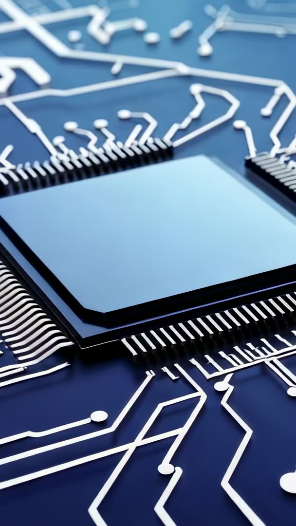 AI Generated Image. Tilting camera revealing glossy microchip and white circuit traces on blue PCB. Showing close-up macro detail, shallow depth of field, reflective chip surface, and precise solder pads. Vertical orientation optimized for mobile platforms, delivering cinematic tilt motion for vertical ads, social reels, and app backgrounds. Ideal for tech product promos, semiconductor explainer videos, corporate innovation presentations, educational tutorials, and industrial manufacturing marketing. Recommending adding bold headline text near top, subtle color grade to enhance blue tones, and slow motion or music for dramatic effect.