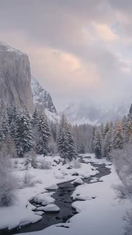 AI Generated Video. Vertical video tilting over snowy alpine stream valley, capturing soft pastel sunrise light warming conifer tops and granite cliff faces. Meandering creek flowing between snow-covered boulders, creating natural leading lines toward distant snowcapped peaks. Evergreen trees dusted with fresh snow adding textural contrast against smooth granite and pale sky. Footage working well as cinematic opener, travel promo, relaxation loop, social media reel, or mobile wallpaper. Suggested uses including winter tourism advertising, outdoor adventure marketing, nature documentary establishing shots, meditation app backgrounds, and seasonal website hero clips. Optimized for vertical platforms such as Instagram Reels, TikTok, mobile ads, and full-screen vertical displays.