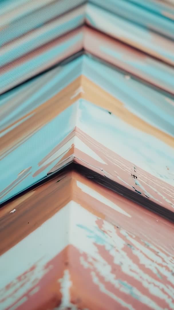 AI Generated Image. Vertical video tilting along chevron seam on corrugated metal roof, showing peeling paint, rust spots, chipped layers, and weathered patina. Tight framing, shallow depth of field, and diagonal composition highlighting textured surfaces and color contrast between muted teal and warm rust orange. Footage suiting industrial design visuals, architectural detail reels, urban decay narratives, and social media vertical ads. Clip suiting background loops, texture overlays, music video transitions, restoration before-and-after sequences, and editorial pieces about roofing maintenance and material aging. Providing options for speed ramping, color grading, and looping to match project tone. Delivering moody, tactile aesthetic for branding, set design references, or stock footage libraries.