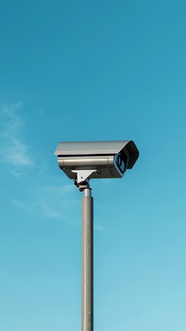 AI Generated Video. Video showing tilting metal surveillance camera housing mounted on tall pole against clear azure sky, swivel bracket visible. Vertical orientation providing tall composition and abundant negative space for overlay text or title. Clean industrial aesthetic and crisp blue background making footage suitable for technology, security, urban planning, infrastructure projects. Use as hero clip for security company website, background for corporate safety presentation, motion graphic element for news or documentary on surveillance, cutaway for smart city and IoT videos. Edit-friendly vertical framing and steady tilt movement supporting social media reels, mobile ads, app demos. Color grading highlighting metal tones and sky blue for easy branding and color matching.
