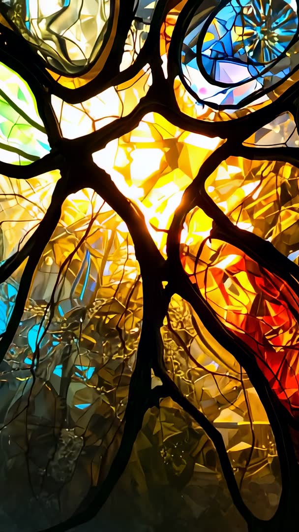 AI Generated Image. Tilting vertical video capturing close-up of backlit stained glass panel with lead came forming dark veins across colorful facets. Sunlight filtering through blue, green, amber, red glass producing warm glow and crystalline reflections. Emphasizing texture, abstraction, and color contrast for artistic and architectural storytelling. Ideal for use in worship visuals, heritage documentaries, cathedral tourism promos, interior design reels, and artisan craft profiles. Pairing with ambient organ music or soft instrumental underscore for emotive atmosphere. Providing 9:16 vertical format optimized for mobile stories, reels, and social ads; trimming and looping for seamless background playback. Offering color grading options to enhance warmth or cool tones and creating branded title screens, overlays, or motion graphic transitions.