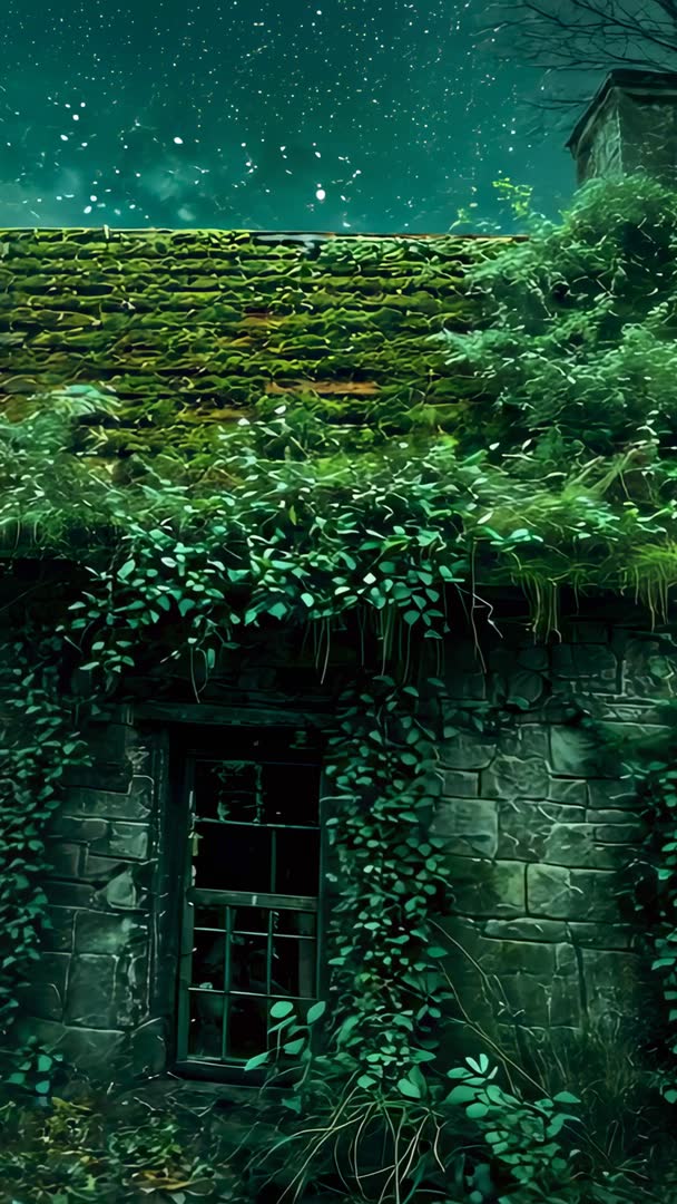 AI Generated Image. Vertical video tilting upward along mossy stone facade of abandoned cottage, revealing broken window, ivy-clad walls and moss-covered roof under starry sky. Slow camera movement creating gentle reveal with drifting leaves and scattered light particles, evoking moody, mysterious atmosphere and sense of nature reclaiming architecture. Suggested uses: pairing with ambient sound design and low piano for horror or suspense trailer, using as opening shot for urban exploration or decay-themed documentary, placing under vertical title card or social media ad for travel, restoration, or environmental campaigns, looping for background in music video or VJ set. Editing tips: adding slow dissolve and subtle zoom for cinematic pacing, grading toward cool green tones to enhance mood, layering faint wind and cricket ambiences, cropping for portrait-first platforms while preserving roof-to-sky reveal.