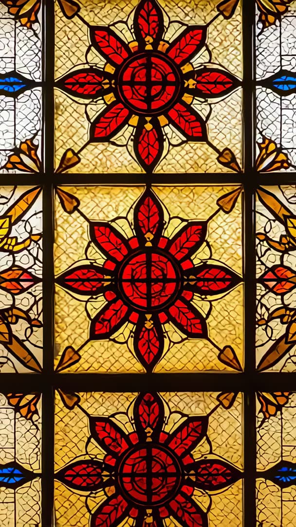 AI Generated Image. Vertical video capturing camera tilting upward through hall revealing backlit leaded glass panel with three red rosette medallions framed by mullions and grid. Warm amber light glowing through textured glass while red petals form bold geometric floral pattern, creating dramatic vertical sweep. Clip working well as opening shot, title card background, architecture or heritage documentary footage, hotel or museum promo, and social media vertical ad. Visual space allowing for overlaying text, slow motion edits, or looping background behind voiceover. Color palette and ornate detail supporting vintage, Victorian, or artisan craft themes and restoration storytelling.