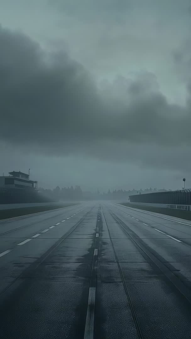 AI Generated Image. Vertical video tracking wet runway centerline stretching into fog beneath heavy storm clouds, control tower silhouetting left horizon. Runway surface reflecting cloud light and tire marks creating strong leading lines toward vanishing point. Mood moody and atmospheric with minimalist composition, ideal for dramatic openers, aviation safety segments, weather reports, and transportation documentaries. Use as cinematic establishing shot for film and TV, vertical teaser for social media platforms, smartphone wallpaper, or background for title sequence and lower third graphics. Recommend color grading with cool desaturated tones or high-contrast cinematic teal and green to enhance tension; add subtle slow zoom or rack focus for motion. Shot formatted vertical 9:16, compatible with Instagram Reels, TikTok, YouTube Shorts and mobile display.