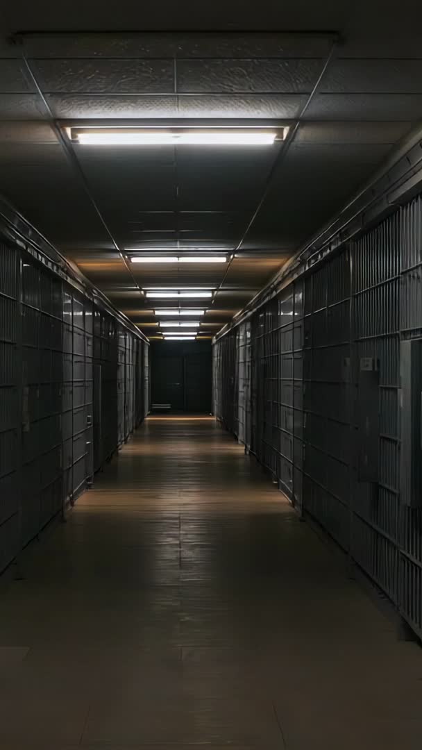 AI Generated Image. Vertical footage showing long empty prison corridor with rows of barred cells and fluorescent ceiling lights. Camera holding steady on central vanishing point, emphasizing symmetry, repetition, deep perspective. Low-key lighting creating moody, tense atmosphere, suiting crime or thriller productions, documentary sequences, social justice campaigns. Serving as opening shot for crime drama, interstitial for true crime podcast, background for prison reform campaign, stock clip for suspense trailer. Edit-friendly neutral timing and framing enabling slow push-in, reveal, title overlay. Vertical orientation optimizing use for mobile reels, social stories, portrait video ads.