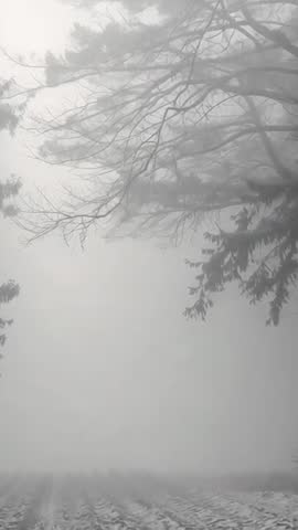 - Vertical video: tree branches swaying while fog masks field furrows under soft winter light