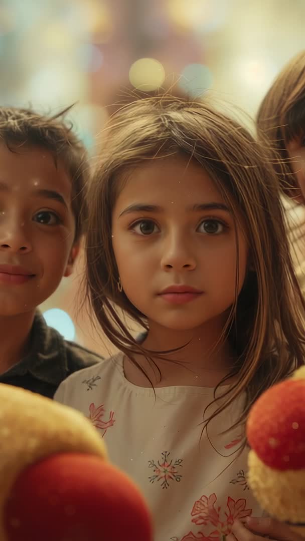 AI Generated Video. Vertical closeup video clip showing trio of children with center girl wearing floral dress, holding plush toys and gazing directly at camera. Warm bokeh lights creating soft, cinematic background with shallow depth of field and natural skin tones. Expressions conveying curiosity, innocence, playful bonding and gentle emotion while foreground toys adding tactile, childlike detail. Composition working well for mobile-first framing and vertical storytelling. Use for Instagram Reels, TikTok stories, mobile ads, parenting blog posts, preschool or toy product campaigns, charity and fundraising content, family lifestyle branding, magazine cover art, greeting card or poster design. Clip ready for color grading, easy cropping to square or horizontal formats, and use as hero clip, thumbnail, testimonial backdrop or social media intro.