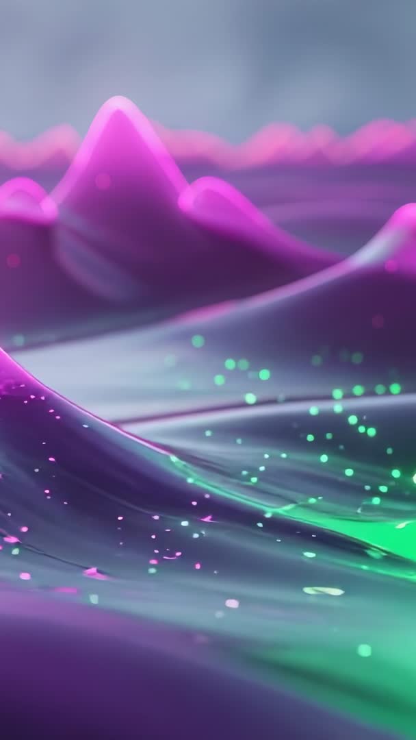 AI Generated Image. Vertical video showing undulating neon fluid waveform flowing across surreal digital terrain, punctuated by drifting glowing particles and subtle bokeh highlights. Color palette featuring vivid pinks, purples, and emerald greens creating high-contrast futuristic mood and soft depth. Motion style providing slow parallax, smooth wave motion, and particle drift that is ideal for looping or short-form content. Use for mobile ads, social reels, app intros, music visualizers, event openers, and tech presentation backgrounds. Combine with overlay text, logo reveal, or audio pulse to create immersive brand visuals and sci-tech themed promos.
