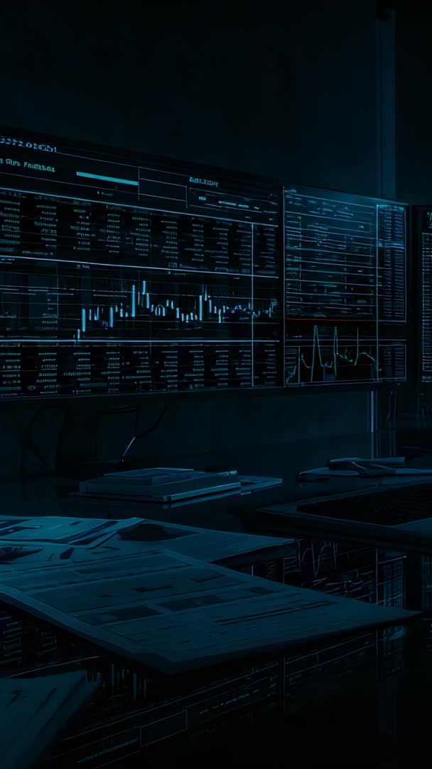 AI Generated Image. Vertical video presenting updating monitors with live data streams and fluctuating financial charts across multiple screens in control room. Dark teal lighting creating futuristic mood while desk with documents and keyboard providing foreground depth and context. Ideal for use in fintech promos, trading floor B-roll, business intelligence presentations, cybersecurity demos, app launch reels, and social media vertical ads. Usage tips: apply subtle color grading to enhance teal highlights, add lower-third titles or animated overlays for KPI callouts, loop clip for continuous background, and trim to match music beats for dynamic pace. Delivering modern, data-driven visual that enhances tech and finance narratives.