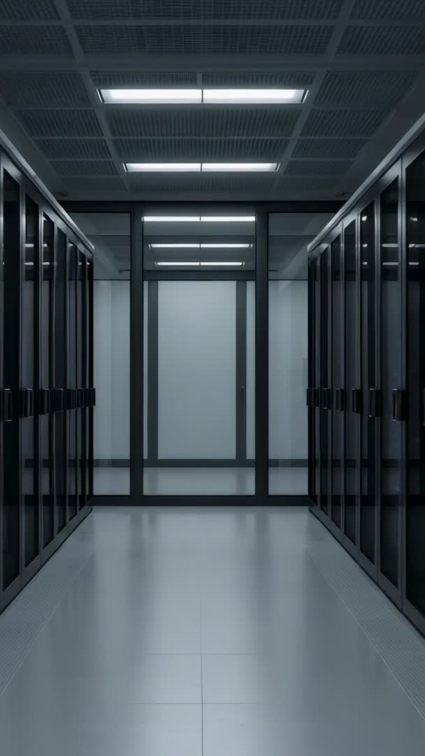 - Vertical video walking empty data center aisle with server racks, glass doors, LED panels