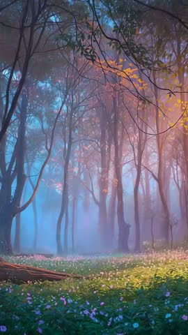 AI Generated Video. Showing warm morning light pouring through tall trees in misty woodland at dawn, revealing fallen log, dew-covered wildflowers and soft rays filtering through fog. Vertical 9:16 orientation designed for mobile-first content and social media reels. Ideal for meditation and wellness videos, travel promos, nature documentary openers, cinematic intros, book covers, seasonal marketing and mobile wallpapers. Employing slow pans, gentle crossfades, warm color grading and soft ambient soundtrack enhances cinematic mood. Conveying tranquil, dreamy and atmospheric tones suitable for relaxation playlists, mindfulness apps, spa promos and background footage for voiceover narration. Providing clear foreground elements for text overlays and branding while preserving soft depth for immersive storytelling.
