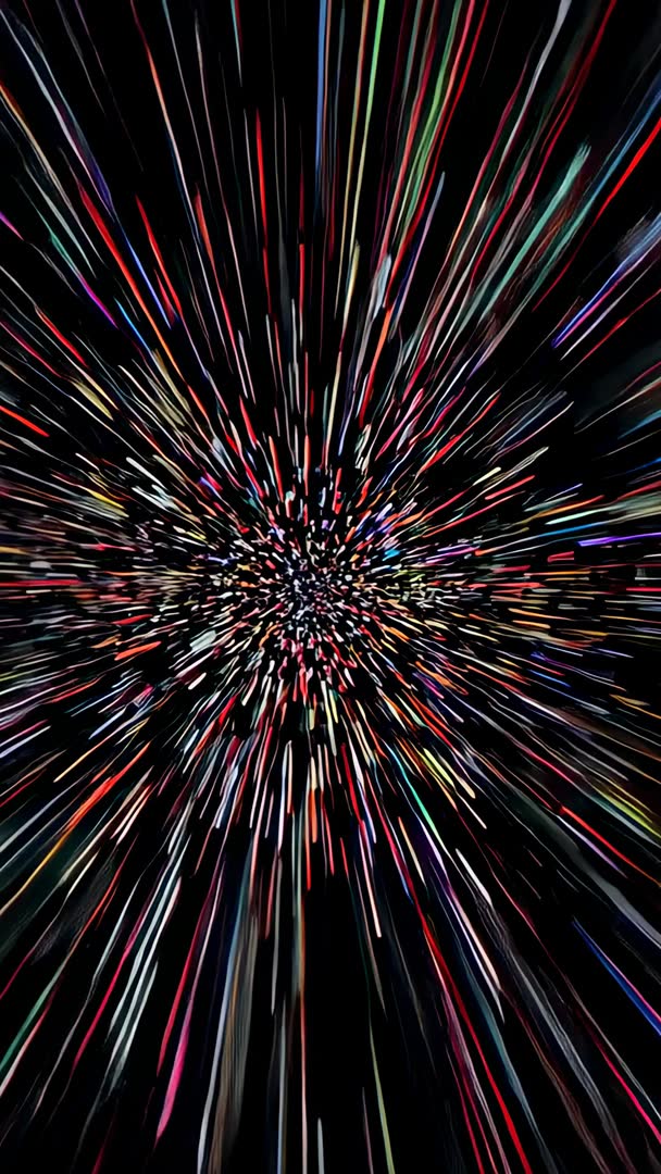 AI Generated Image. Showing radial core zooming outward in black void, radiating neon streaks and central white flare. Creating sense of hyperspeed and immersive depth with colorful spectrum trails and extended motion blur. Serving vertical video projects including social media reels, mobile ads, music visualizers, VJ loops, title openers, and sci-fi promos. Enhancing designs by providing dynamic background, energetic transitions, and attention-grabbing hero banner for landing pages and event promotions. Looping smoothly for continuous playback; supporting speed ramping, color grading, and audio-reactive effects in video editors.