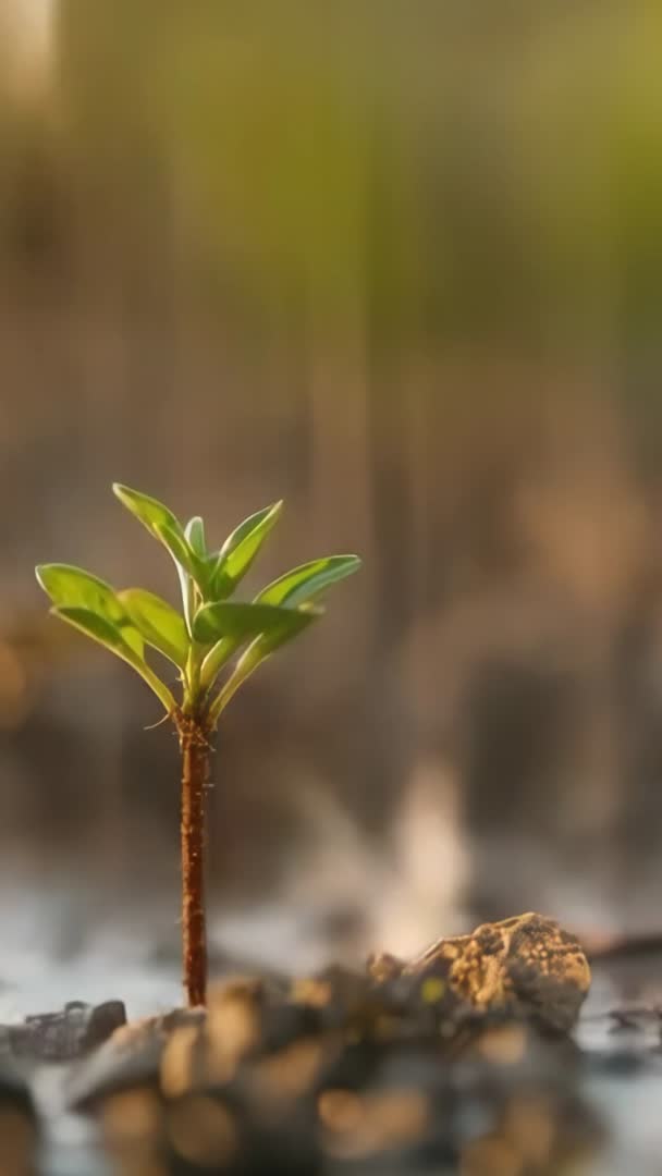 AI Generated Image. Vertical close-up video showing water stream watering young seedling and forming puddle around stem in soft golden light. Shallow depth of field highlighting new leaves and moist soil, creating peaceful, hopeful mood. Useful for social media reels, Instagram Stories, TikTok, YouTube Shorts, environmental campaigns, sustainable brand ads, gardening tutorials, educational content on plant care, and corporate sustainability presentations. Works as looping background for text overlays, banner headers, mobile-first video ads, app splash screens, and nature documentary sequences. Technical notes: vertical orientation 9:16, close-up macro framing, gentle motion suitable for slow-motion edits, natural ambient water sound optional.