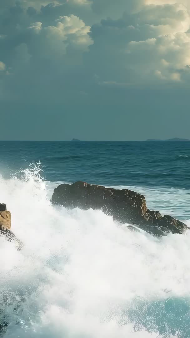 AI Generated Image. Vertical 9:16 video showing swell rising from horizon, wave cresting and hitting rocky outcrop, spray exploding into foamy mist and filling lower frame. Dramatic cloudbank building overhead, deep teal water and distant island silhouettes adding scale. High-energy motion and strong contrast between dark rock and white spray create cinematic tension. Suggested uses: hero background for mobile and social campaigns, vertical story and reel content, travel and adventure promos, surf and weather segments, nature and conservation pieces, documentary openers, and dramatic title overlays. Editing tips: extract slow-motion segments, grade to teal-cyan palette, add ambient wind or cinematic soundtrack, and create seamless loop for continuous background. Footage optimized for vertical display and mobile platforms.