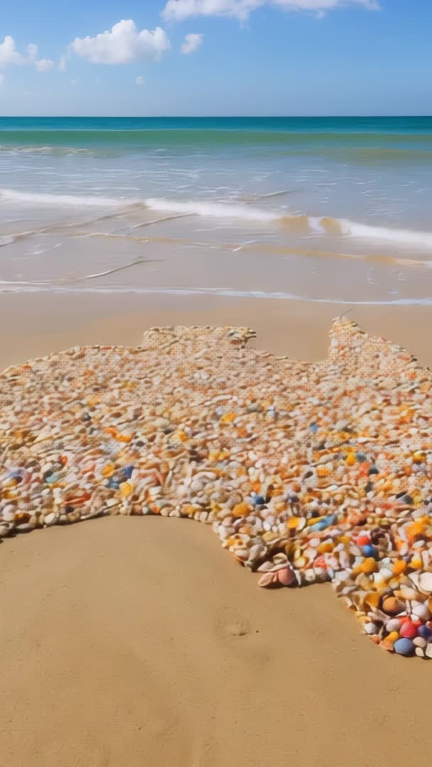 AI Generated Image. Video showing incoming ocean waves gently lapping painted seashells scattered across sandy shore. Water is receding and leaving wet sheen on sand, creating delicate foam lines and subtle reflections. Foreground focusing on colorful shells and textured patterns, distant turquoise water meeting clear sky at horizon. Visual offering calm, rhythmic motion and soft pastel palette. Ideal for meditation app backgrounds, social media vertical reels, travel promo clips, wellness brand content, beach lifestyle campaigns, or website hero loops. Looping friendly clip suitable for mobile-first projects, presentations, ads, and relaxation playlists.