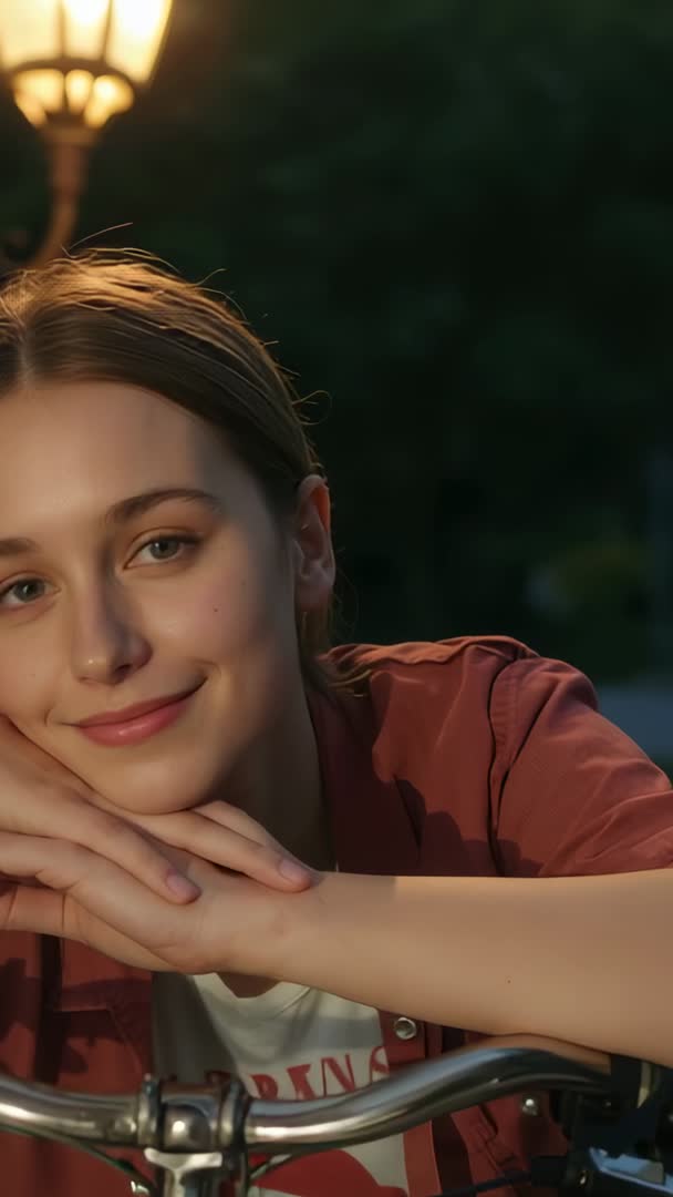 AI Generated Video. Video showing young woman leaning on bike handlebars at twilight, resting with eyes closed under warm streetlight. Close-up vertical framing emphasizing face, hands, and chrome handlebar details with soft background foliage blurring. Warm lamp light creating cinematic contrast against cool evening tones, conveying calm, contentment, and quiet reflection. Suitable for social media reels, vertical ads, lifestyle campaigns, wellness promotions, and travel or urban leisure stories. Useful as B-roll for storytelling sequences, thumbnail for mindfulness or evening routine videos, and background clip for romantic or nostalgic scenes. Color grading and gentle slow motion recommended to enhance mood. Model release recommended for commercial use.