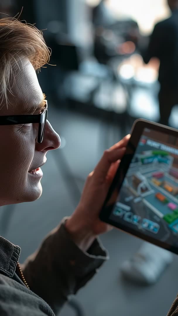 AI Generated Video. Showing woman wearing glasses and jacket holding tablet while presenting colorful dashboard interface. Focusing on profile and device with studio background softly blurred to emphasize on-screen content. Displaying interactive charts, icons and map elements suitable for app demo, product presentation, training clip or social media vertical ad. Suggesting use in startup pitch, corporate training, UX case study, marketing reel or tech tutorial. Recommending adding lower third, call-to-action overlay and upbeat background music to increase engagement. Advising safe-area for vertical delivery and providing space for text or logo in upper right corner.