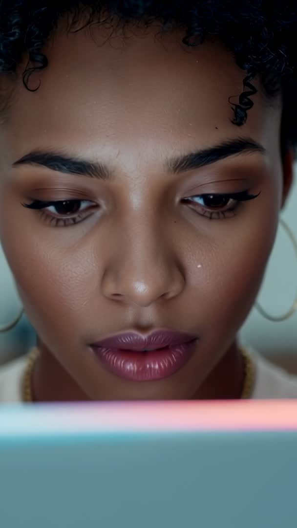 AI Generated Image. Featuring close-up vertical video of woman reading on laptop under soft screen glow, shifting gaze then speaking. Capturing focused expression, subtle makeup detail, hoop earrings, and warm skin tones for intimate portrait feel. Suitable for social media content, influencer reels, online course promos, remote work advertising, technology and beauty campaigns. Use for thumbnail clips, mobile-first ads, editorial pieces about concentration and digital lifestyle, or voiceover-driven tutorials. Recommend using gentle ambient soundtrack, soft color grade, and short captions for vertical platforms.