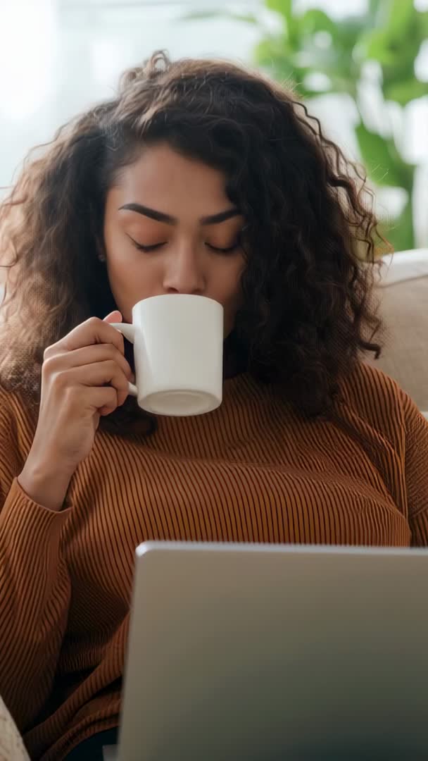 AI Generated Video. Vertical clip showing woman sipping coffee while working on laptop on couch. Close-up framing capturing calm morning mood, soft daylight, indoor plant bokeh, warm tones from brown sweater. Fitting remote work, work from home, lifestyle, and wellness themes. Serving social media reels, mobile ads, app onboarding, blog hero clips, and corporate wellness campaigns. Editing suggestions: cropping to 9:16 for vertical mobile use, expanding to 16:9 for website banner, adding subtle color grade to enhance warm tones, overlaying logo on lower third, adding captions for accessibility. Licensing ideas: pairing with articles about productivity, morning routines, flexible work, freelance life, coffee brands, and interior decor. Including alt text and short captions highlighting relaxed focus and coffee break.