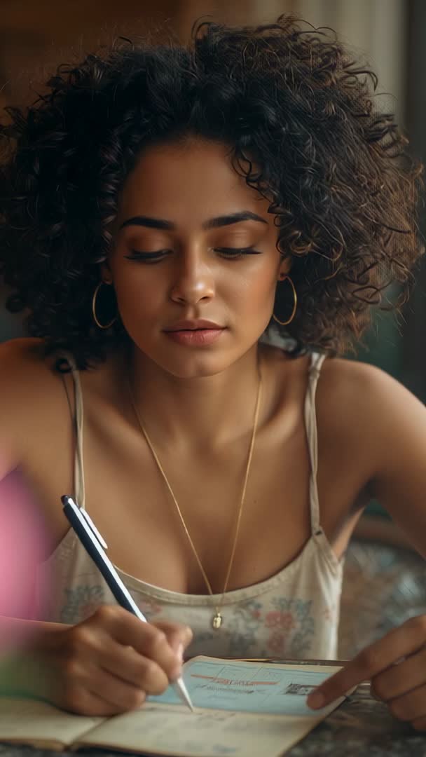 AI Generated Image. Writing in journal, woman focusing on thoughts while holding silver pen over lined pages. Showing close-up vertical frame with warm natural light and shallow depth of field, highlighting wooden table texture. Conveying themes of mindfulness, introspection, creativity, slow living and self care. Featuring curly hair, hoop earrings and delicate pendant necklace adding personal style. Useful for wellness and mental health content, journaling tutorials, productivity tips, lifestyle social media Reels, guided reflection videos, stationery and pen advertising. Pairing well with soft ambient music, gentle voiceover or motivational quote overlays. Leaving ample space for title and caption overlays at top and bottom of frame. Supplying versatile clip for branding, editorial storytelling, app promo or online course material.