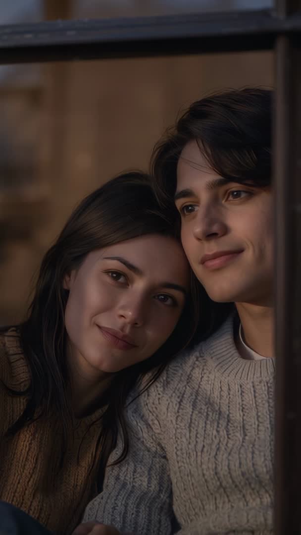 AI Generated Video. Vertical video showing young couple sitting at window, woman resting head on partner shoulder, both wearing cozy sweaters and soaking soft sunlight. Close framing and soft light conveying intimacy, warmth and quiet companionship, subtle smiles and relaxed body language adding authenticity. Vertical frame 9:16 with cinematic color grading, shallow depth of field and gentle warm tones creating cozy atmosphere. Ideal for romantic lifestyle content, dating app promos, relationship blogs, Valentine's Day campaigns, cozy home decor features, mental health pieces about connection, travel or slow living vlogs. Serving as hero footage for website banners, social media reels, vertical ad spots, product overlays for knitwear and home textiles, or emotional brand storytelling.