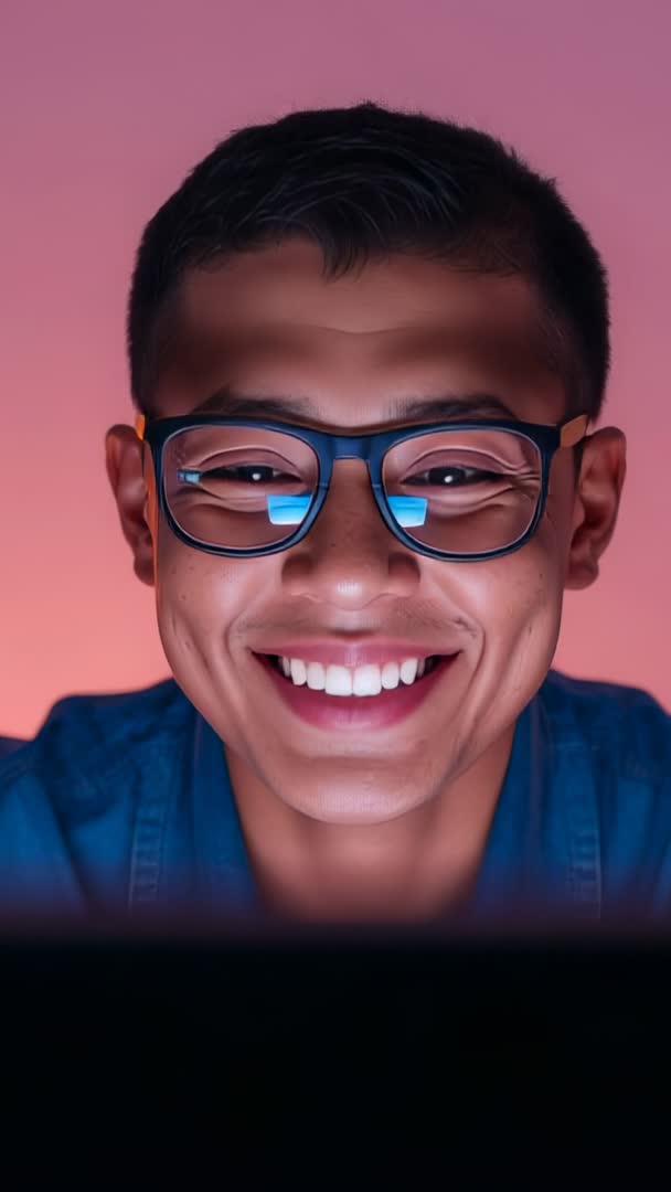 AI Generated Video. Closeup vertical video showing young man wearing glasses and smiling while looking at laptop. Glasses reflecting blue screen glow, gradient pink background adding warm mood. Face filling frame with sharp focus on eyes and teeth, subtle screen reflections visible on lenses. Lighting creating cinematic contrast and modern vibe. Suggested uses: using in mobile app promos, social media stories, influencer marketing, tech tutorial thumbnails, online course landing pages, video call or telework articles, eyewear or blue light filter ads, student lifestyle content, dating app profiles, vlogger reaction clips. Production notes: leaving safe space at bottom for headline or caption overlay, using warm color grading to enhance skin tone, cropping for 9:16 vertical formats, pairing with upbeat music or subtle ambient track for social media engagement.