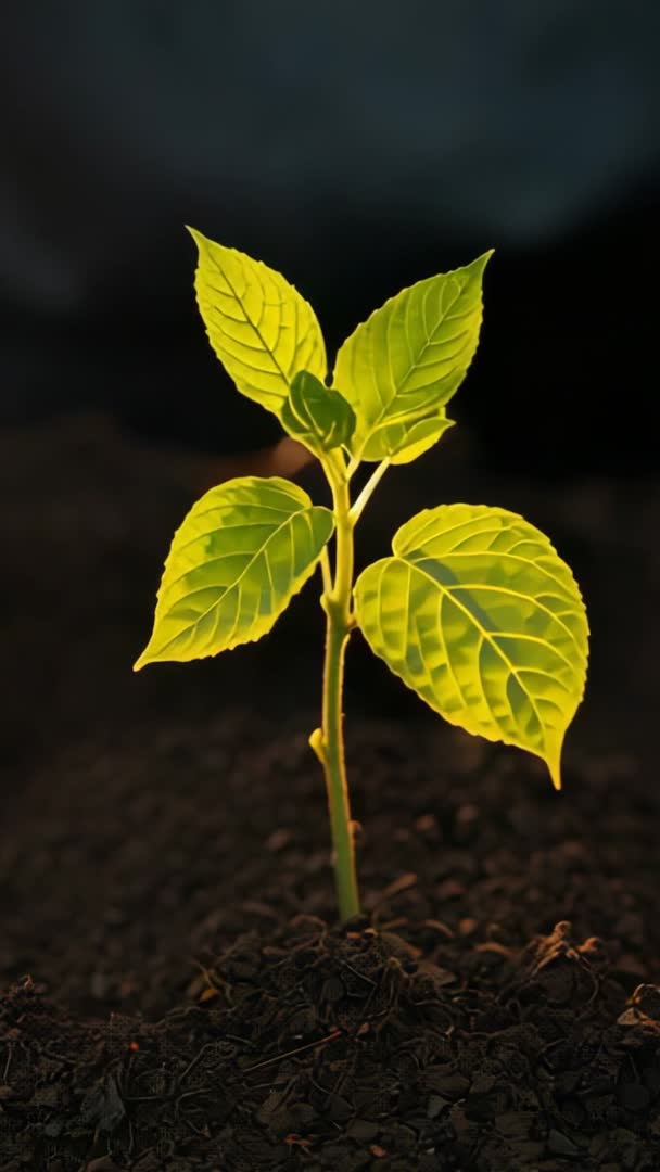 AI Generated Image. Showing young green sapling emerging from dark, rich soil with warm backlight accenting leaf veins and slender stem. Close-up vertical footage capturing delicate textures, vibrant greens, and high contrast between plant and background. Conveying themes of growth, renewal, nurturing, sustainability, and hope. Ideal for use in environmental campaigns, sustainability presentations, eco product advertising, organic gardening tutorials, reforestation and conservation storytelling. Working well as intro or overlay clip for social vertical formats such as Instagram Reels, TikTok, Facebook Stories, mobile ads, and vertical web banners. Pairing with ambient music, soft piano, or calm voiceover while applying slow upward zoom, gentle parallax, or loop to emphasize continuous growth. Providing clean negative space for text, logos, or call-to-action overlays. Delivering strong visual metaphor for corporate social responsibility, green startups, educational content, wellness, and community gardening projects.