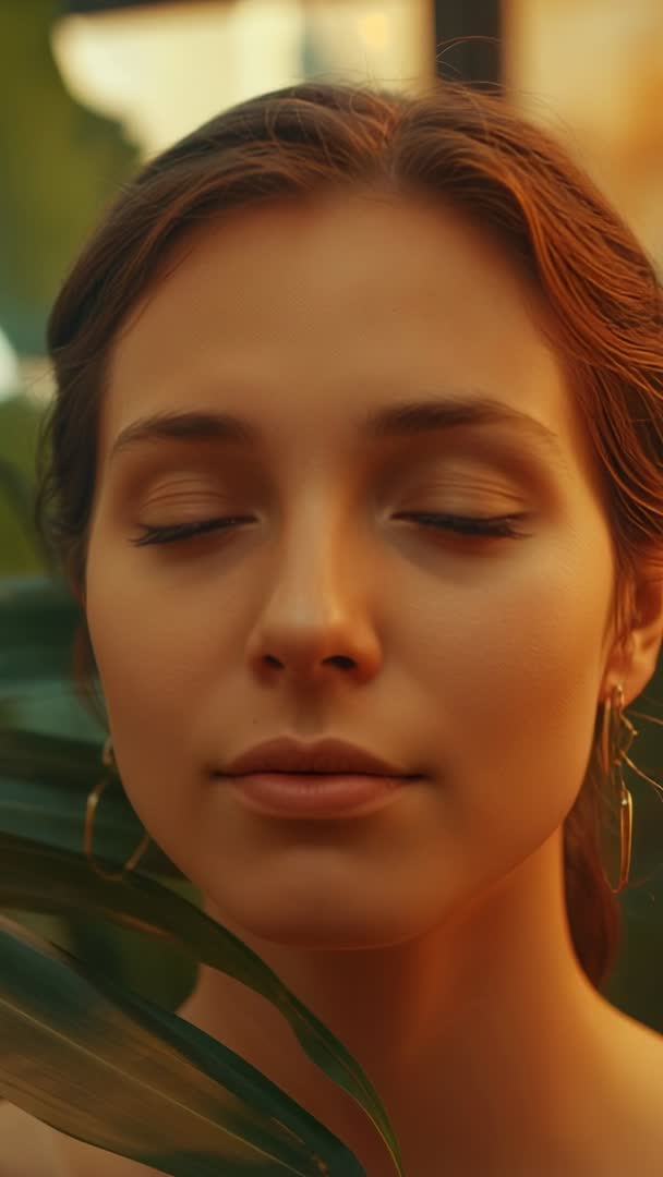 AI Generated Video. Close-up vertical video showing young woman closing eyes and breathing slowly among glasshouse plants. Warm golden-hour light bathing skin while palm leaf moving gently in breeze and hoop earrings catching highlights. Mood conveying calm, presence, mindfulness, inner balance. Ideal for wellness, meditation, spa, guided-breathing, mental-health campaigns. Perfect for mobile-first content such as social reels, vertical ads, app intros, guided meditation clips. Use for website hero sections, social banners, wellness blogs, email headers, product landing pages for natural skincare, aromatherapy, botanical brands. Color palette offering warm amber tones and soft green accents, easy to overlay with headlines or call-to-action. Silent footage adaptable to music or guided narration. Portrait framing and shallow depth-of-field creating intimate, calming composition. License for commercial use.