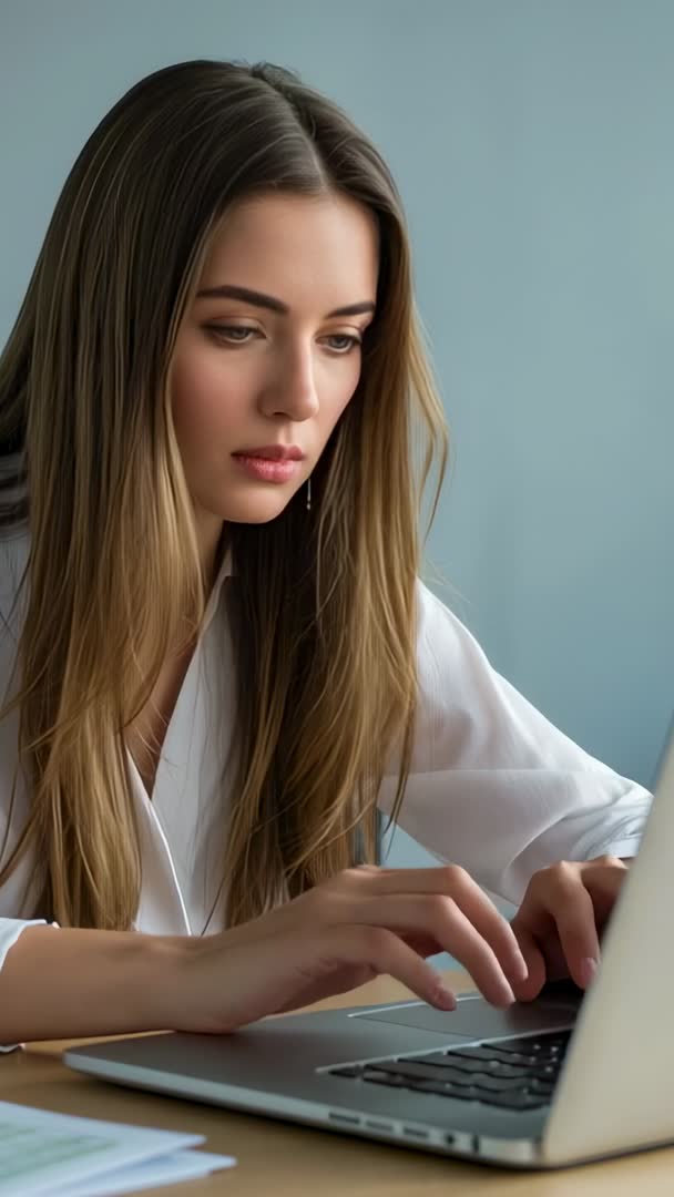 AI Generated Video. Young woman typing on laptop while reviewing documents at desk, conveying focus and productivity. Close-up vertical video capturing facial concentration and hand movement over keyboard. Neutral background keeping attention on subject and work materials. Ideal for business content, productivity blogs, online course intros, corporate training, HR recruitment pages, and social media vertical ads. Use for hero clips on websites, thumbnails for tutorials, presentation slides about remote work, study habits, or administrative tasks. Color palette and composition supporting modern professional branding and editorial layouts.
