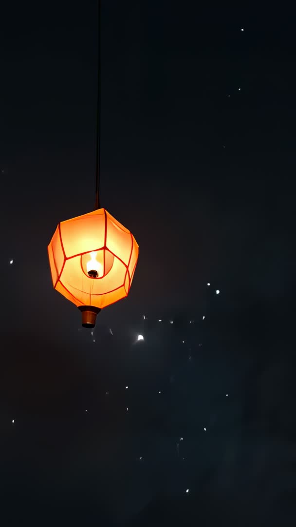 AI Generated Image. Camera zooming closer to hanging orange lantern at night, revealing bulb and sparks and warm amber glow. Lantern glowing against deep navy background with scattered star-like specks and soft bokeh, creating cinematic and moody atmosphere. Vertical composition emphasizing strong negative space for text overlay or lower third graphics. Use ideas: - Festival and celebration intros for Mid-Autumn, Lantern Festival, Diwali, wedding storytelling and cultural events. - Social media vertical content for Instagram Stories, Reels, TikTok, and mobile ads. - Background for meditation, relaxation, ambient music videos, and mood-driven scenes. - Promotional clips for restaurants, bars, hotels, and event venues seeking intimate warm lighting. - Title opener or transition clip for short films, vlogs, travel reels and brand videos. Technical notes and tips: - Loop-friendly segment when holding steady frame on lantern glow for smooth repeat. - Color palette centered on warm amber and deep blue for strong visual contrast and cinematic grading. - Vertical safe space top area for headline placement and lower third for logos or captions. - Pair with gentle ambient audio, subtle crackle or distant crowd sound for enhanced atmosphere.