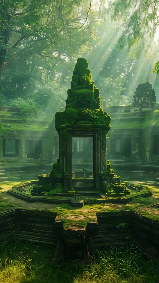 AI Generated Image. Featuring vertical camera pushing into moss-covered stone shrine at center of circular temple courtyard, shafts of sunlight piercing jungle canopy and soft mist drifting through ancient colonnade. Slow push-in motion and shifting light are creating cinematic, meditative atmosphere ideal for storytelling, ambient backgrounds, or title openers. Filming in 9:16 vertical format, suited for social reels, mobile ads, documentary sequences, meditation and wellness loops, game environment previews, and historical explainer segments. Color palette is dominated by lush greens and weathered stone textures, offering strong contrast for title overlays and color grading. Editors are able to loop footage seamlessly for extended runtime, crop for landscape presentations, or pair with ambient sound design for immersive scenes.