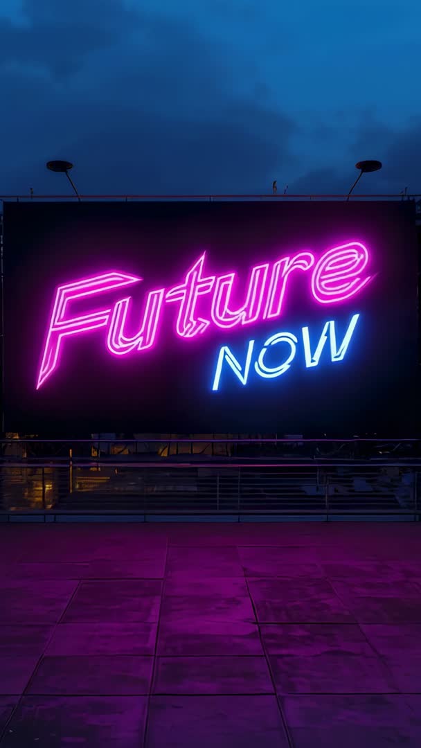 AI Generated Video. Vertical video capturing camera zooming toward neon Future NOW billboard on rooftop at dusk, with purple and blue lights reflecting on wet tile floor. Composition offering strong foreground reflections and wide dark sky for overlaying text or graphics. Mood blending retro neon and futuristic cyberpunk style for high-impact visuals. Ideal for promoting tech launches, digital products, startup campaigns, live event intros, social media short-form ads (TikTok, Instagram Reels, YouTube Shorts), and website hero backgrounds. Use for title opener by adding animated logo, inserting headline text over sky area, or looping as ambient background for presentations and trade show displays. Footage suiting color grading, sound design, and motion graphics enhancement.