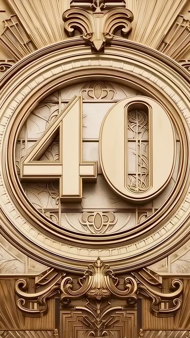 AI Generated Video. Vertical video showing camera slowly zooming into ornate gold medallion set in decorative panel, revealing large 40 crafted in filigree and framed by sunburst crest and embossed relief. Close-up capturing intricate metalwork, carved motifs, polished highlights and warm metallic tones, with rich relief texture and subtle patina. Slow, cinematic motion creating dramatic reveal and elegant visual focus ideal for high-end presentations. Suggested uses include anniversary opener, milestone announcement, luxury brand promo, event teaser, broadcast bumper, Instagram Reels or TikTok background, product reveal for jewelry or premium packaging, and heritage or restoration documentary intro. Post production tips: Adding subtle ambient orchestral bed and a low-impact impact hit at reveal, applying warm color grade and gentle vignette, placing overlay text or logo in upper or lower negative space for branding, and smoothing motion with slight ease-in on zoom. Technical notes: Vertical 9:16 composition ideal for mobile platforms, providing 4K source for flexible cropping, and recommending 24-30fps for cinematic motion and seamless looping by matching first and last frames.