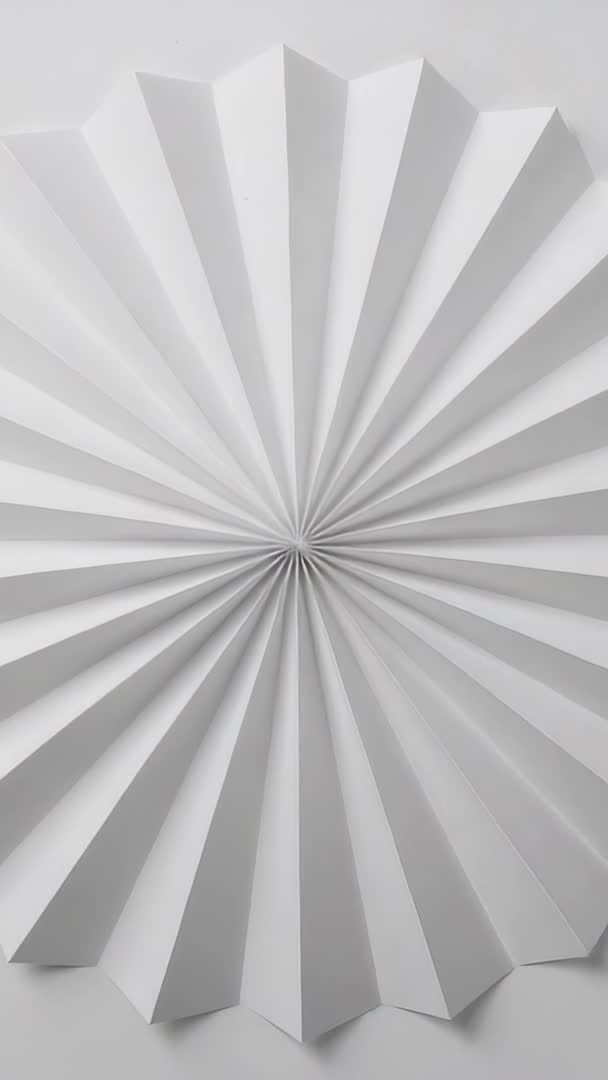 AI Generated Video. Showing vertical video zooming into white folded paper rosette on gray wall, revealing crisp radial pleats and subtle shadow play. Minimal monochrome palette and geometric symmetry creating calm modern visual ideal for design projects. Perfect for background use in social media stories, vertical website headers, product reveal openers, event promo intros, and looping motion backdrops for presentations. High-contrast texture and centered composition offering versatile overlay for print layouts, packaging mockups, branding campaigns, or craft tutorials. Crop-friendly vertical frame and smooth motion making this clip ready for quick edits and animated transitions.