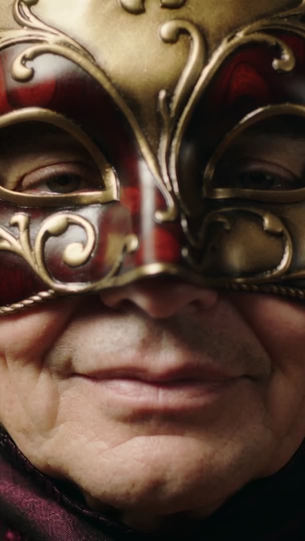 AI Generated Video. Vertical video showing camera zooming in on mature man wearing ornate gold Venetian mask and burgundy hood, revealing skin texture, subtle smile, and eyes peeking through decorative eyeholes. Filming in studio with cinematic lighting and shallow depth of field, capturing metallic scrollwork, polished gold highlights, and deep burgundy tones. Ideal for masquerade event promos, carnival campaign, theatrical trailer, costume and fashion editorial, luxury brand storytelling, identity and mystery concepts, and Halloween marketing. Serving as close-up hero clip, intro or transition, mobile vertical ad, social media reel, or looped background for title overlays. Suggested edits include color grading to enhance gold and burgundy contrast, speed ramping during zoom for dramatic effect, and adding subtle ambient soundtrack for mood. Useful for creative directors, event promoters, costume designers, editorial teams, and social media content creators seeking intimate, mysterious portrait footage.