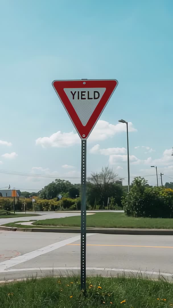 AI Generated Video. Video showing camera slowly zooming in on triangular YIELD sign at suburban intersection, highlighting crosswalk, median, curb and sidewalk under clear blue sky. Framing offering strong vertical composition and negative space for overlay text or lower third graphics. Serving traffic safety campaigns, road rule instructional videos, urban planning presentations, driving tutorials and news segments about local infrastructure. Working well as B-roll for documentary or corporate videos about transportation, insurance and municipal services. Fitting mobile-first vertical social media ads, story reels, app backgrounds or on-screen interstitials for editorial content. Providing clear subject focus and calm suburban atmosphere for conveying safe driving message and pedestrian awareness.