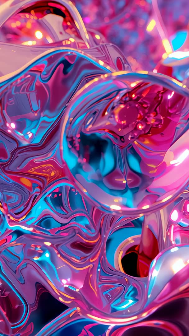 AI Generated Image. Camera zooming through neon chrome folds, revealing fluid metallic surfaces, mirrored reflections, and iridescent highlights. Colors pulsing with magenta, cyan, and deep violet tones, evoking futuristic cyberpunk atmosphere. Suitable for background footage in tech product launches, title sequences, mobile ads, social media stories, music video overlays, stage visuals, and digital art installations. Editing suggestions: looping short clip for seamless motion, adding subtle parallax with text, applying color grade to match brand palette, syncing motion with electronic or synthwave music. Technical notes: vertical aspect ratio 9:16, high-resolution source, fast cuts for rhythm-friendly edits, optimized for vertical-first platforms and touchscreen previews.