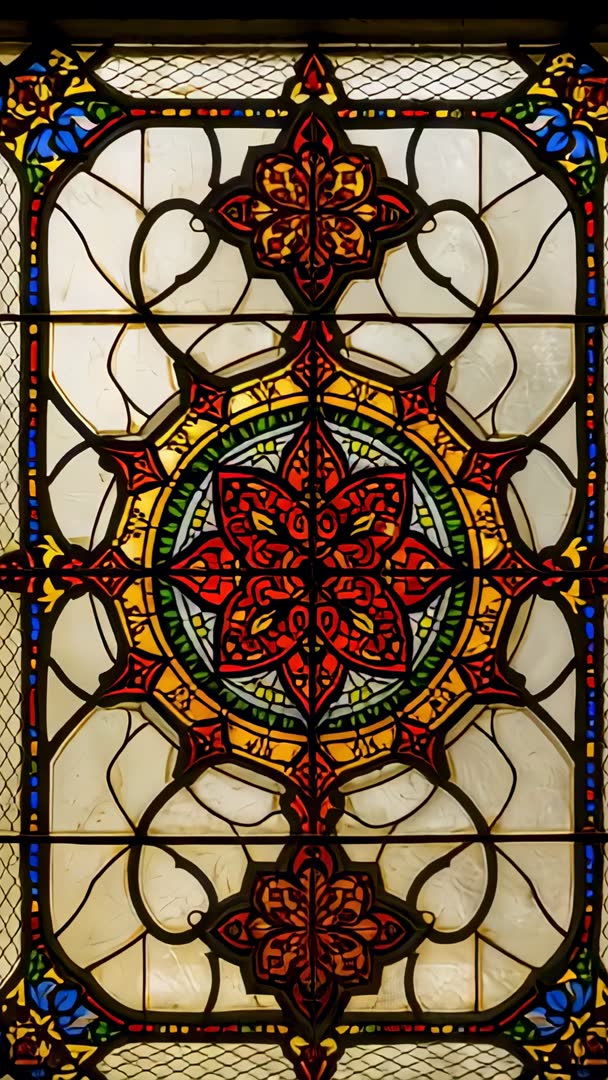 AI Generated Image. Vertical cinematic clip showing slow zoom toward ornate red medallion set within stained-glass church window. Lead cames forming floral geometry, vibrant reds, golds and greens contrasting with opalescent background, textured glass catching diffused interior light. Camera movement revealing layered craftsmanship, solder lines and subtle glass imperfections that add authenticity. Vertical format optimized for smartphone viewing and social platforms, delivering immersive upward reveal perfect for vertical reels and stories. Suggested uses: worship videos, architecture documentaries, church history features, cultural heritage projects, title sequences, meditative backgrounds, museum digital tours, advertising for restoration services, interior design portfolios, cinematic transitions. Editing tips: pair with ambient organ or choral music, apply gentle color grade to boost warm tones, use slow crossfade or parallax cut for seamless integration.