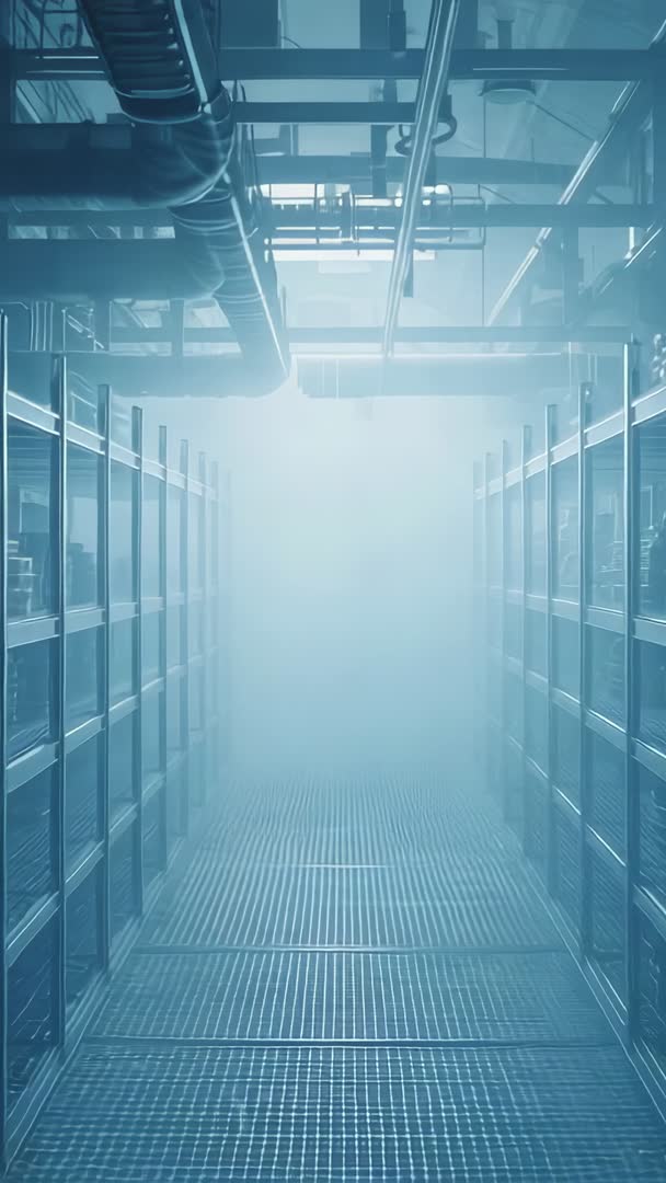 AI Generated Video. Vertical footage featuring slow pushing camera moving down industrial warehouse aisle over grated metal grate toward pale foggy light. Ceiling ducts and metal shelving are framing corridor, creating strong leading lines and deep vanishing point. Cool blue color grading and soft haze are producing moody, cinematic atmosphere. Useful for adding industrial or tech mood to projects, providing background footage for corporate videos, logistics or manufacturing presentations, security system demos, and sci?fi or thriller sequences. Working well as vertical hero video for mobile ads, social reels, app backgrounds, or website headers. Editing tips: allowing overlay text or logos in pale center area, applying slow color grade to enhance blue tone, adding slight camera shake or parallax for cinematic depth, and looping clip for continuous ambient B?roll.