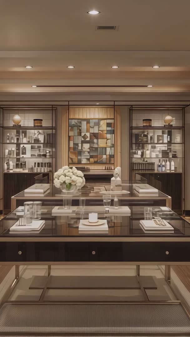 AI Generated Video. Vertical gliding cam zooming forward, revealing glass display table topped with white floral arrangement and stacked books inside luxury boutique interior. Built-in shelving units framing background, showcasing curated beauty and lifestyle products under warm recessed lighting. Composition emphasizing symmetry, reflective surfaces, clean lines, neutral color palette, and textured wood accents, conveying refined and tranquil mood. Ideal for retail marketing, brand promotion, social media hero clips, website header video, interior design reels, and in-store digital signage. Useful as B-roll for product launches, store tour sequences, lifestyle commercials, and mood-setting introductions. Editing suggestions: pairing with soft ambient soundtrack, slow cross-dissolve transitions, warm color grade, and subtle vignette for cinematic mood. Licensing options suitable for commercial campaigns, e-commerce promotions, and editorial features.