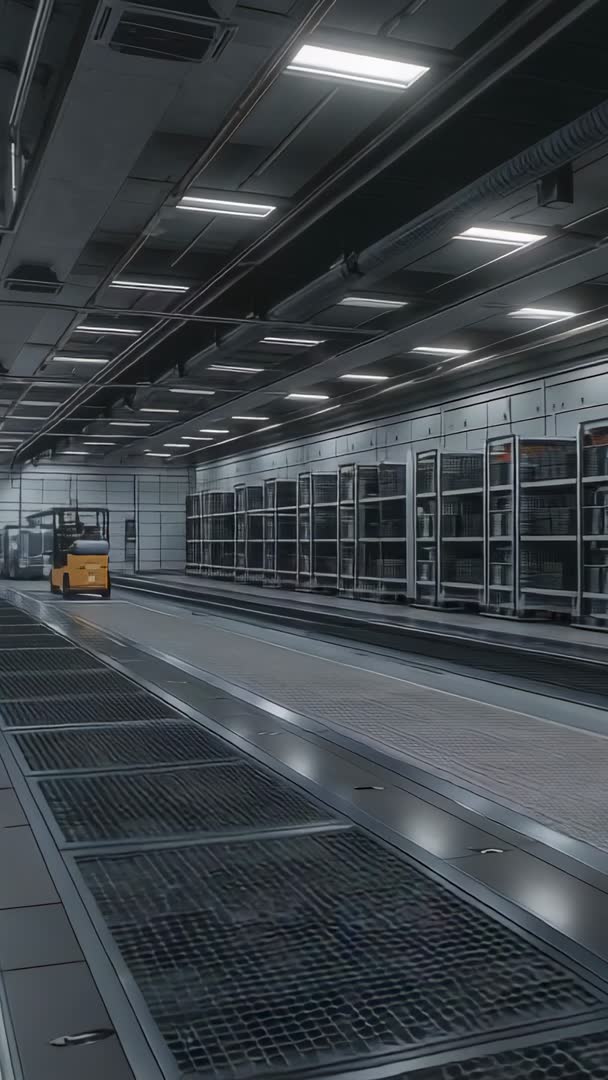 - Vertical warehouse aisle video showing yellow forklift moving past metal racks under industrial LED