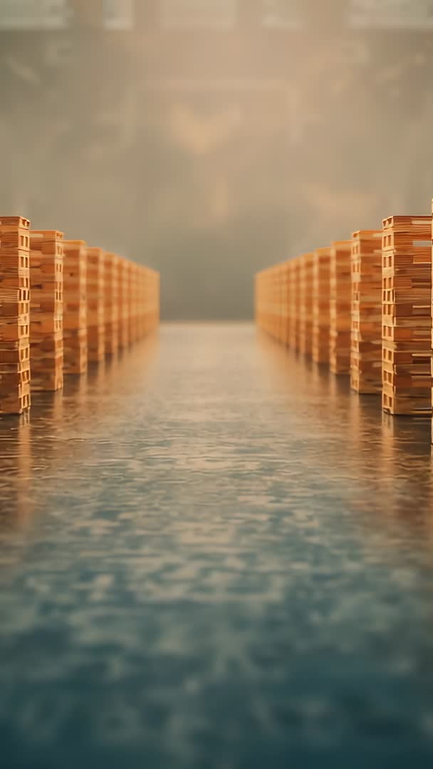 AI Generated Image. Vertical video showing camera moving forward between rows of stacked wooden pallets over rippling water, creating strong symmetry and deep perspective. Warm golden light and soft haze adding cinematic mood while highlighting pallet texture and water reflection. Suggested uses: logistics and supply chain storytelling, warehouse safety training, shipping and freight promotions, brand intros, website hero backgrounds, social media reels, and corporate presentations. Composition optimized for vertical mobile viewing and for slow dolly or looping motion; compatible with text overlays and lower thirds.