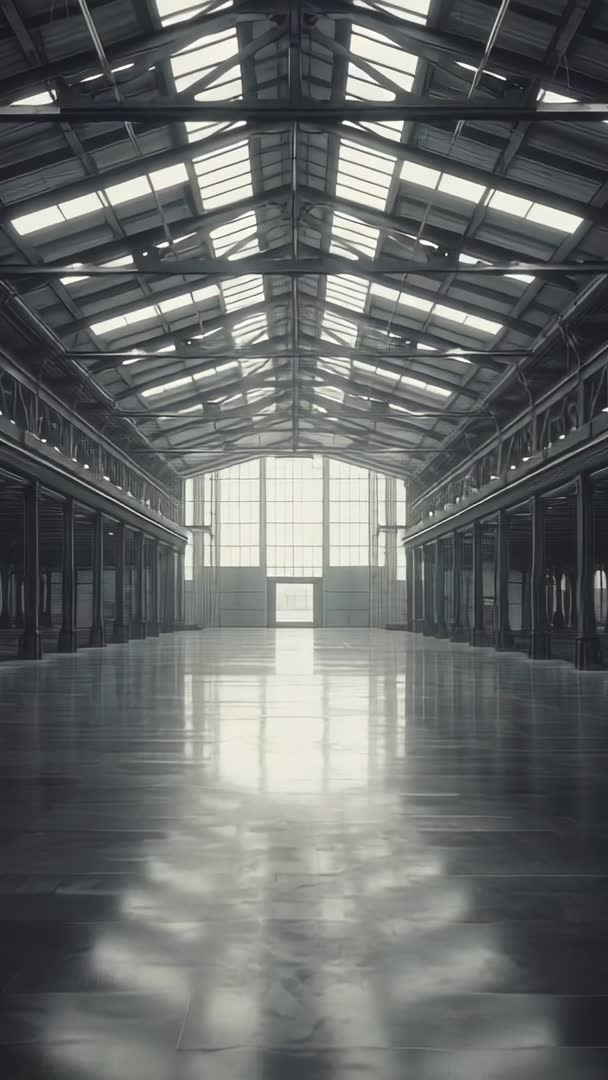 AI Generated Image. Vertical video showing empty warehouse hall with long central aisle and high skylit roof. Sunlight moving across skylights, casting shifting bands of light on polished floor and creating mirrored reflections and strong symmetry. Mezzanine walkways and steel trusses lining sides, large glass wall at far end admitting soft daylight. Monochrome palette and minimal composition highlighting scale, geometry, and industrial texture. Usage ideas: - Architecture and design reels showcasing structural detail and conservation projects - Corporate and product promos needing cinematic empty interior or backdrop for titles - Exhibition and event trailers for gallery, museum, or trade show spaces - Film and music video establishing shots for urban or industrial narratives - Real estate and redevelopment presentations highlighting adaptive reuse Production notes: - Vertical orientation optimized for social media stories, reels, and mobile ads - Time-lapse or slow-motion editing enhancing moving light and floor reflections - Color grading options: monochrome, desaturated, warm daylight tones