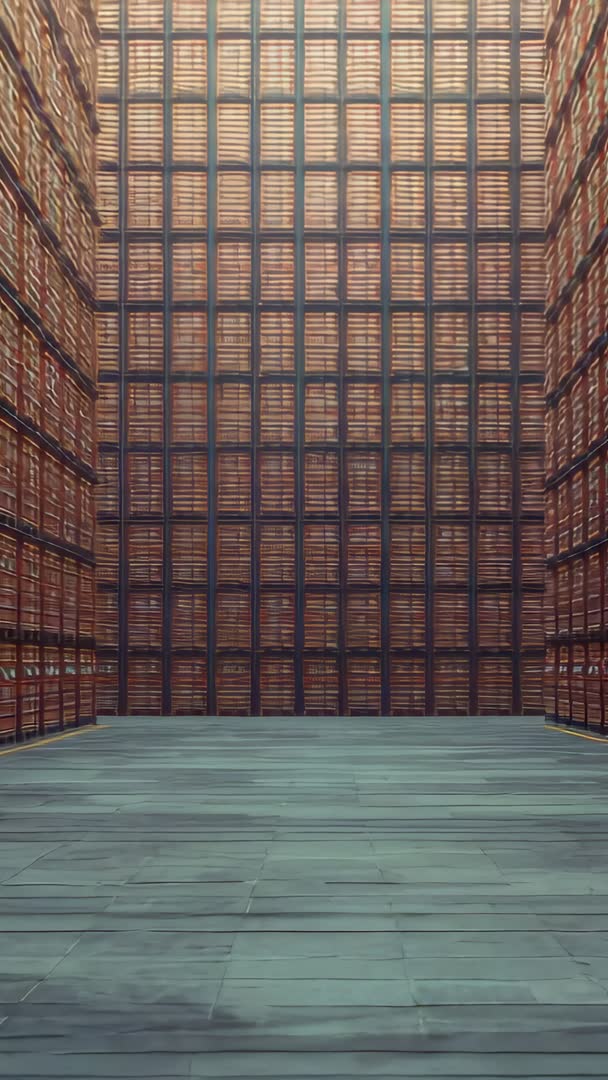 AI Generated Image. Vertical video footage showing empty polished concrete floor leading to towering wall of wooden crates and pallet racks inside high-ceiling warehouse. Grid-like shelving forming strong symmetry and converging perspective lines; wide foreground providing ample negative space for titles, logos, or product placement. Footage working well as logistics and supply chain B-roll, inventory management presentation opener, corporate explainer clip, promotional social media reel, or intro sequence for industrial documentary. Use for text overlays, animated lower thirds, product mockups on floor, or background behind voiceover. Color palette balancing warm wood tones with cool concrete floor for strong contrast with bold typography. Slow push-in or parallax pan enhancing sense of scale and depth while maintaining clean composition for mobile-first vertical edits.