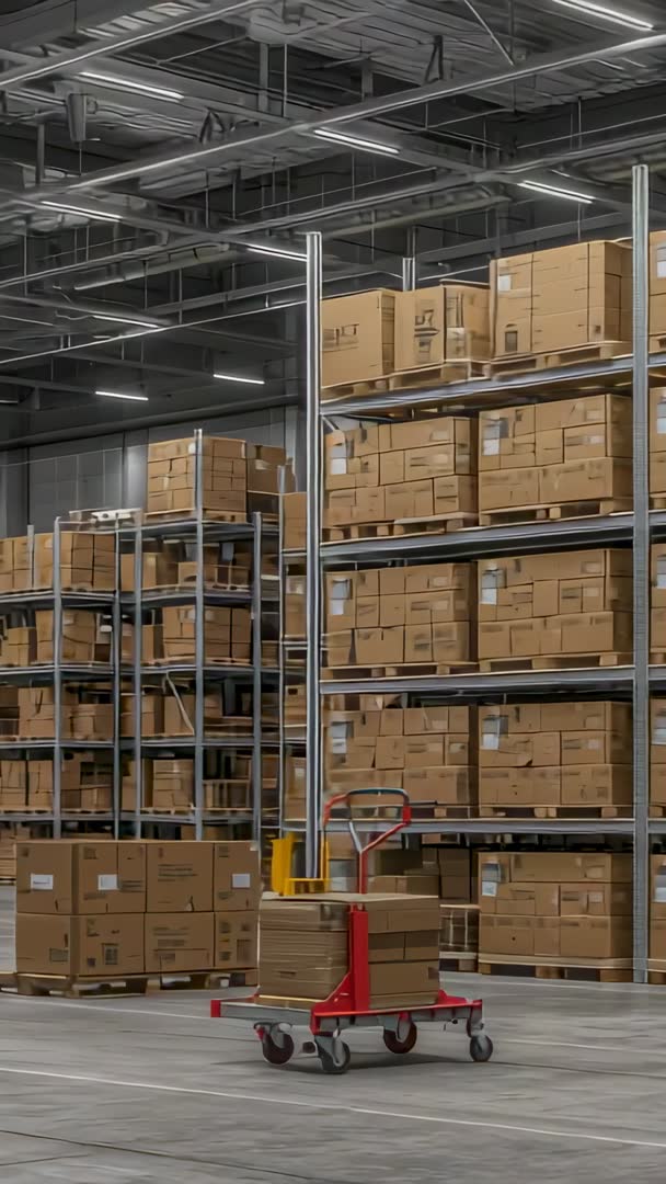 AI Generated Image. Red pallet truck transporting stacked boxes down wide warehouse aisle, with tall metal racking filled with uniform cardboard cartons and clear concrete floor conveying efficient distribution environment. Overhead LED lighting highlighting organized pallets and marked aisles, creating strong visual for operational workflows. Filming in vertical format for mobile-first and social media use. Suggested uses: - Illustrating logistics and supply chain processes in training videos and corporate presentations - Promoting e-commerce fulfillment, same-day delivery, and warehouse operations in mobile ads and landing pages - Demonstrating material handling equipment and pallet truck features in product demos and sales materials - Enhancing blog posts, case studies, annual reports, and investor presentations on inventory management and distribution efficiency Post-production ideas: add on-screen captions and call-to-action overlays for vertical ads, apply color grading for brand consistency, and use speed ramps for dynamic social edits.