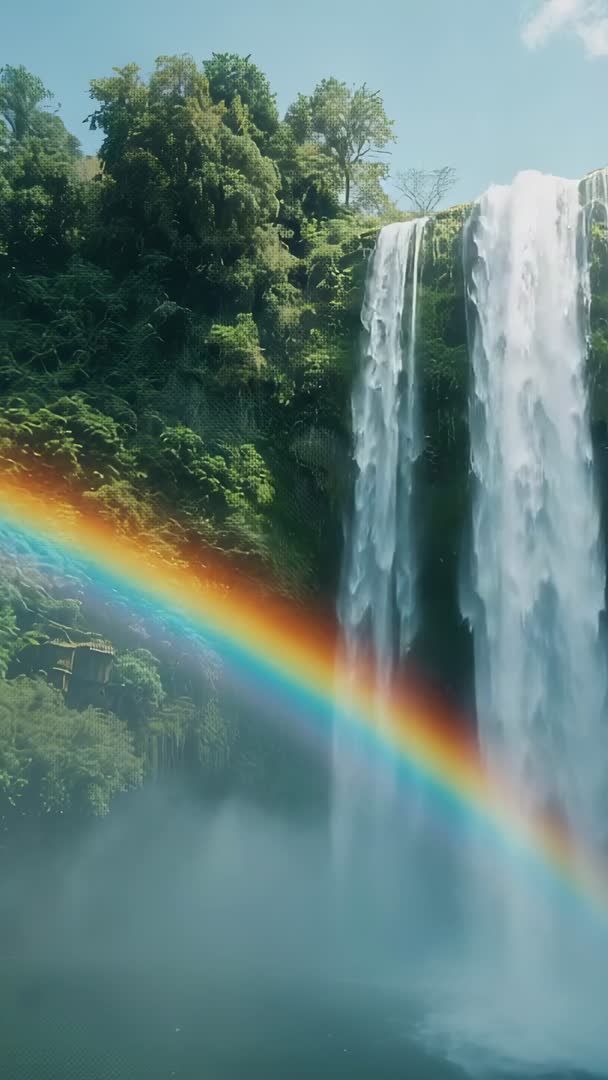 AI Generated Image. Vertical video showing twin cascades pouring into emerald pool while sunlight hitting rising mist and forming vivid rainbow across gorge. Lush forest and sheer cliff framing scene, water plunging with powerful flow and creating soft mist and rainbow prism. Footage capturing cinematic motion and tranquil atmosphere, suitable for slow-motion or ambient sound overlay. Use for travel and tourism promos, eco-tourism campaigns, wellness and meditation apps, social media vertical reels and stories, hotel and resort promotion, nature documentary B-roll, hero header for destination websites, mobile wallpaper and screensaver, or stock footage for commercial video edits. Color grading friendly and compatible with aerial and slow-motion edits.