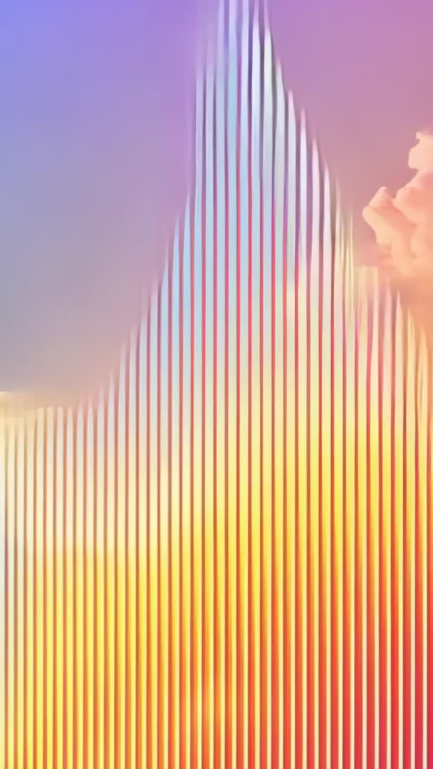 AI Generated Image. Featuring vertical 9:16 waveform bars rising and shifting against pastel gradient sky with soft cloud accent. Colors blending from cool blues and purples at top to warm golds and reds at bottom, creating vibrant futuristic mood. Motion feeling rhythmic and dynamic, matching music beats or data pulses and providing strong visual tempo. Orientation optimized for mobile vertical content and loop-friendly playback for continuous backgrounds. Offering clear negative space and high-contrast lines for text overlay and logo placement along left or center columns. Ideal for music visualizers, DJ or podcast promos, social stories and reels, app intros, streaming overlays, tech presentations, and modern branding campaigns. Supplying scalable clip for fast edits, title sequences, transition screens, or hero backgrounds in advertising and event visuals.