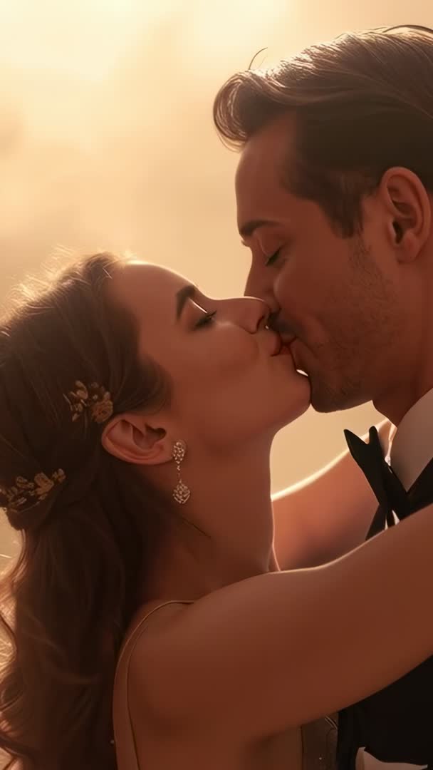 AI Generated Video. Close-up vertical clip capturing newlyweds sharing tender kiss at reception under warm golden light. Bride wearing elegant gown with delicate hairpins and chandelier earrings while groom wearing classic tuxedo. Shot focusing on intimate connection and gentle embrace, conveying romance, warmth, and elegance. Vertical 9:16 format ideal for mobile-first platforms and social video content. Suitable for Instagram Reels, TikTok, wedding highlight reels, venue promotion, bridal shop adverts, jewelry campaigns, invitation videos, wedding blogs, hero banners, and romantic social ads. Cinematic look working well with slow-motion, soft focus, and warm color grading. Use for storytelling sequences, commercial spots, promotional reels, or emotional montage.