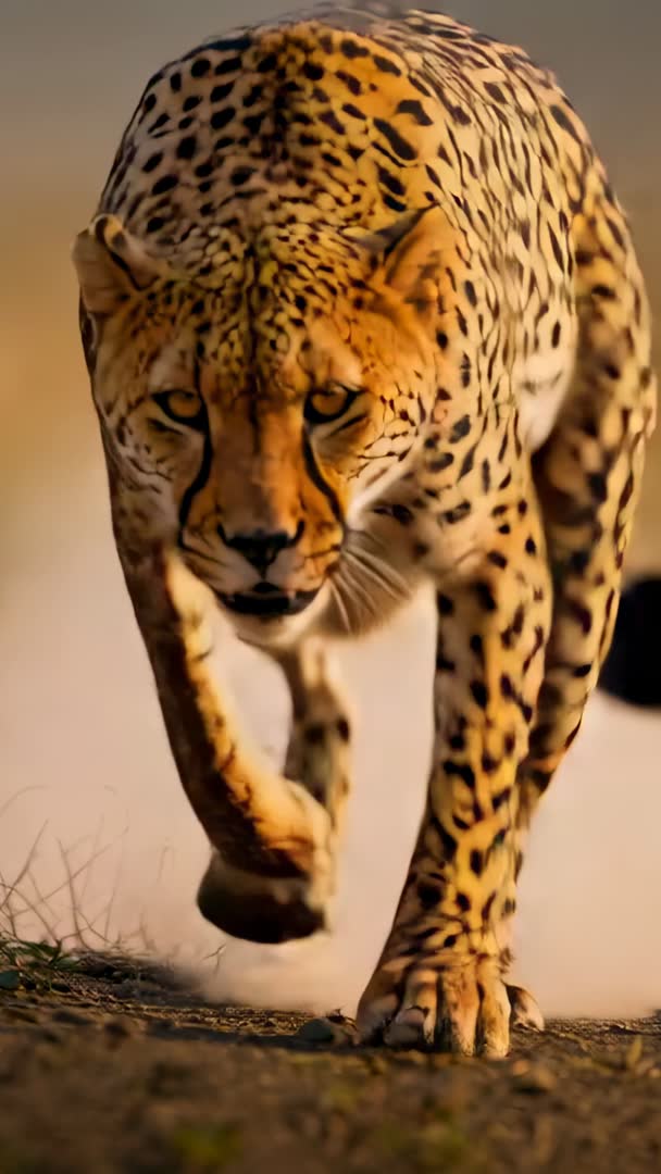 AI Generated Video. Showing cheetah charging across dusty savanna, raising clouds of dust and locking intense stare on camera. Ideal for wildlife documentaries, conservation campaigns, nature films, and dramatic openers for streaming content. Working especially well for vertical formats including social media reels, stories, TikTok, Instagram and mobile ads. Editing suggestions: using slow motion to emphasize stride and muscle movement, adding cinematic score or heartbeat rhythm for tension, applying warm color grade to enhance golden hour tones, and leaving negative space for title or logo overlays. Suitable for educational content about predator behavior, speed and hunting strategy, as well as promotional work for eco-tourism, wildlife nonprofits, and editorial storytelling. Technical notes: vertical 9:16 orientation, close-up perspective, shallow depth of field, dynamic motion and high contrast spot pattern providing strong focal point for dramatic storytelling.